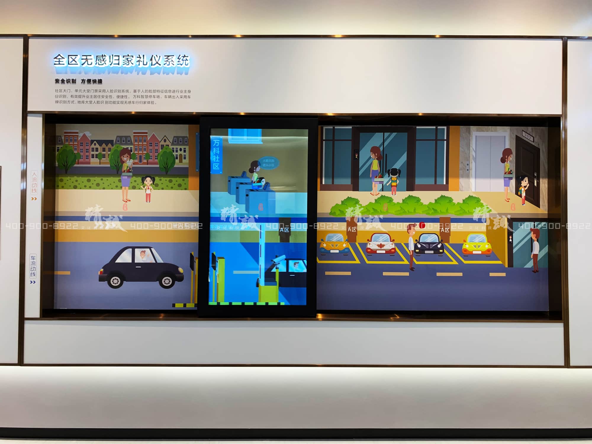 從觸摸屏的社區(qū)日照系統(tǒng)展示,到人車(chē)分流的微縮場(chǎng)景,再到互動(dòng)滑軌屏展示的全區(qū)無(wú)感歸家禮儀系統(tǒng)。