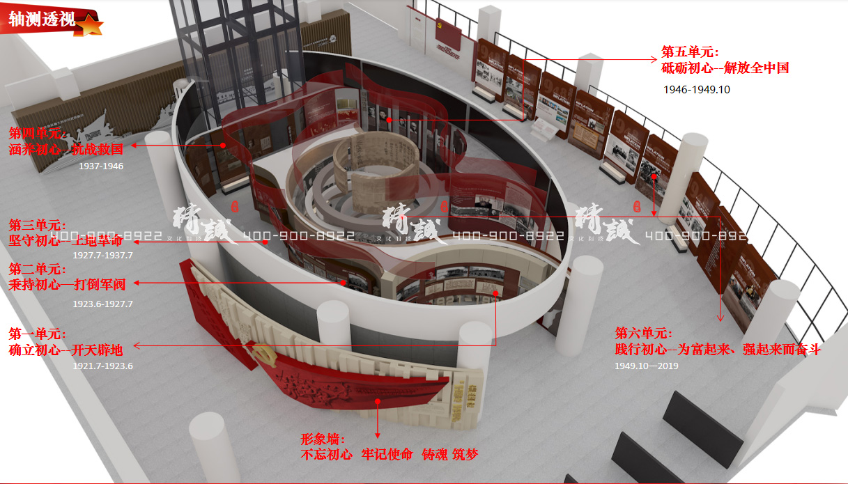 利用博物館中廳現(xiàn)有硬件環(huán)境,搭建獨(dú)立成章又和展館其他空間貫通的展陳空間,展區(qū)整體設(shè)計(jì)遵循簡約而不簡單,豐富而不復(fù)雜的理念,合理巧妙地運(yùn)用多種展陳手段和豐富的史料展品,突出每一部分展陳的重點(diǎn)內(nèi)容,構(gòu)筑一個(gè)黨性與思想性及藝術(shù)性高度統(tǒng)一的黨性文化、黨性教育展示空間。突破傳統(tǒng)的展陳封閉環(huán)境,形式上注重前瞻性、可持續(xù)利用性,可拆卸性、在創(chuàng)新上下功夫,使之與新形勢下的發(fā)展格局相適應(yīng)。