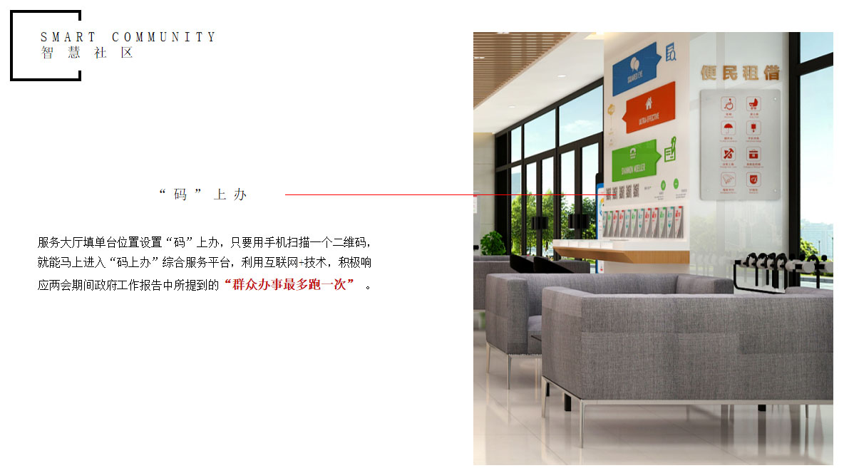 2. “碼”上辦:服務(wù)大廳填單臺(tái)位置設(shè)置“碼”上辦,只要用手機(jī)掃描一個(gè)二維碼,就能馬上進(jìn)入“碼上辦”綜合服務(wù)平臺(tái),利用互聯(lián)網(wǎng)+技術(shù),積極響應(yīng)兩會(huì)期間政府工作報(bào)告中所提到的“群眾辦事最多跑一次” 。