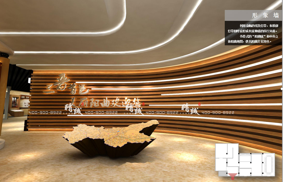 展館入口改為玻璃門,墻面大面積采用拉絲不銹鋼材質,后部輪廓背白光烘托氛圍,面板上部用藍色發(fā)光燈帶勾勒出陽曲縣地圖的一部分作為概念性裝飾,寓意陽曲大門為四方賓朋敞開。