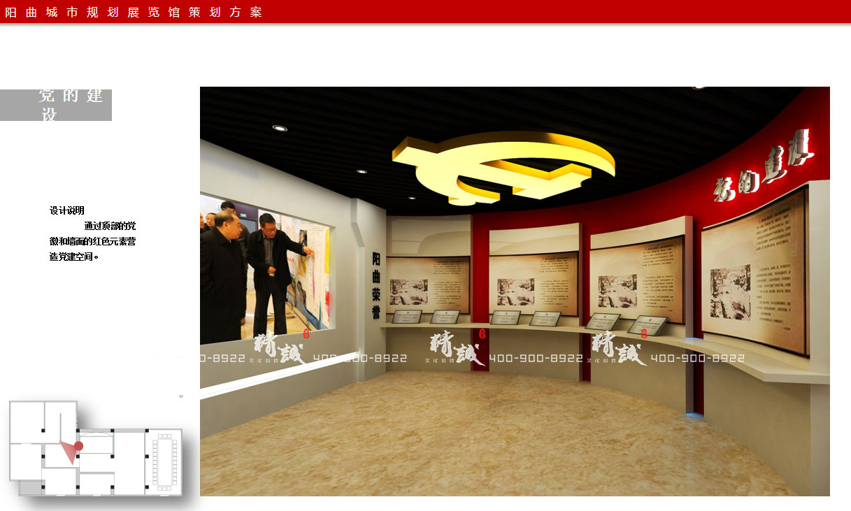 展覽館黨的建設:設計說明,通過頂部的黨徽和墻面的紅色元素營造黨建空間。