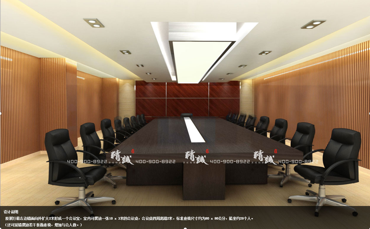 展覽館會議室設計說明:原展廳最右邊墻面向外擴大2米形成一個會議室,室內可擺放一張10 x 3米的會議桌,會議桌四周離墻2米,標準座椅尺寸約為80 x 80公分,能坐約28個人。
