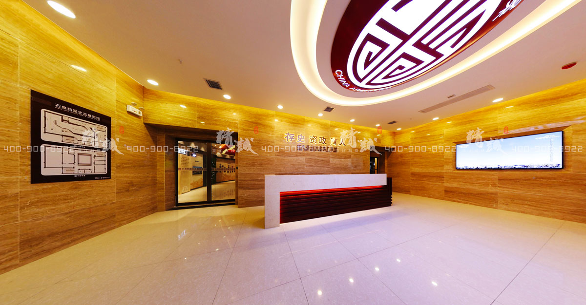 序廳吊頂采用中國(guó)檔案LOGO造型,墻面采用石材裝飾,用折線燈帶裝飾。整體設(shè)計(jì)風(fēng)格簡(jiǎn)約大氣,視覺效果莊嚴(yán)、肅穆 。廳內(nèi)設(shè)置導(dǎo)覽圖、接待處方便參觀者了解參觀動(dòng)線,獲得更好從參觀體驗(yàn)。