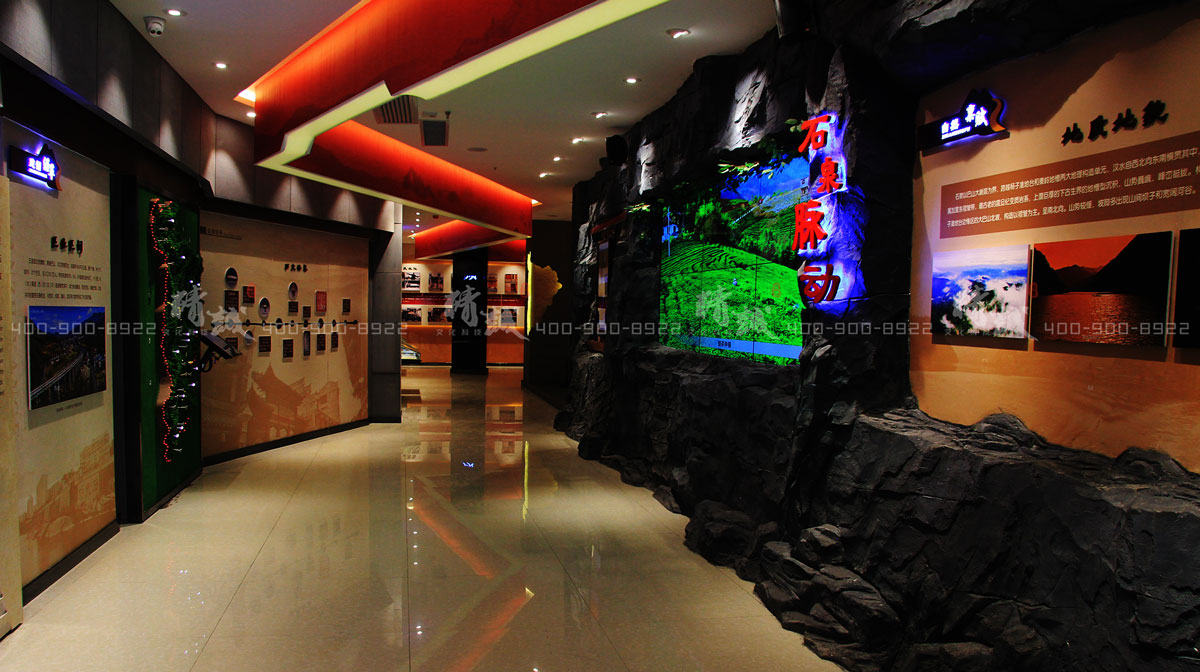“漢水明珠,石上清泉”,講述了石泉縣的建制沿革,采用壁掛式電子沙盤結(jié)合燈光控制查詢機(jī),能夠更直觀地在沙盤上了解石泉縣建制沿革的發(fā)展歷程。利用仿真巖石造型墻,配合電子拼接屏,用科普視頻的形式講述石泉地區(qū)地質(zhì)地貌的演化變遷。