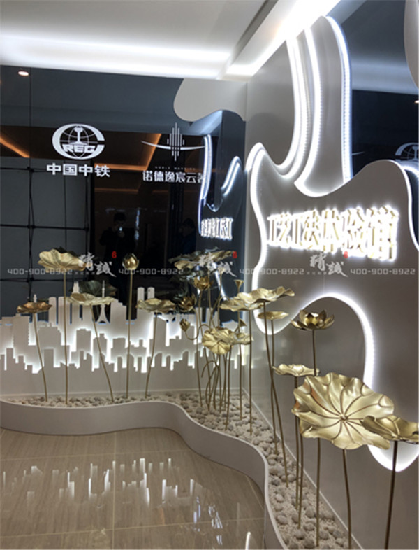 展廳入口利用遠(yuǎn)近視覺感,錯(cuò)落有致的高鐵抽象造型加燈光輔助照明,猶如企業(yè)向告訴列車駛向國際的道路上。
