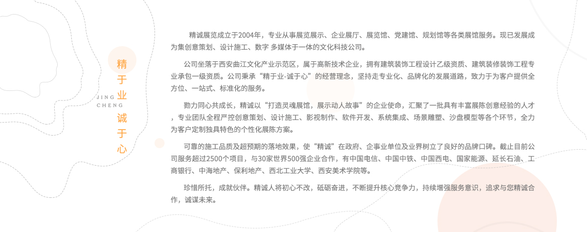 勠力同心共成長(zhǎng),精誠(chéng)以“打造靈魂展館,展示動(dòng)人故事”的企業(yè)使命,匯聚了一批具有豐富展陳創(chuàng)意經(jīng)驗(yàn)的人才,專業(yè)團(tuán)隊(duì)全程嚴(yán)控創(chuàng)意策劃、設(shè)計(jì)施工、影視制作、軟件開發(fā)、系統(tǒng)集成、場(chǎng)景雕塑、沙盤模型等各個(gè)環(huán)節(jié),全力為客戶定制獨(dú)具特色的個(gè)性化展陳方案。