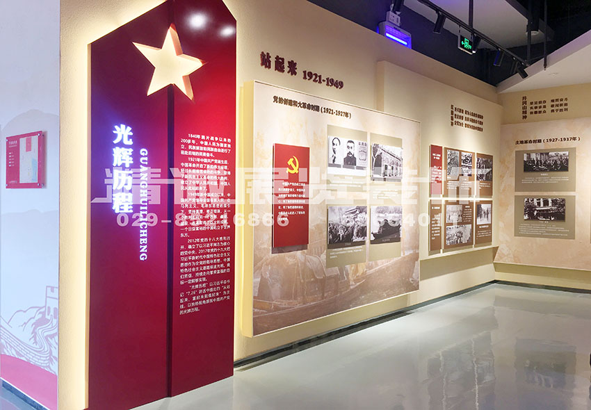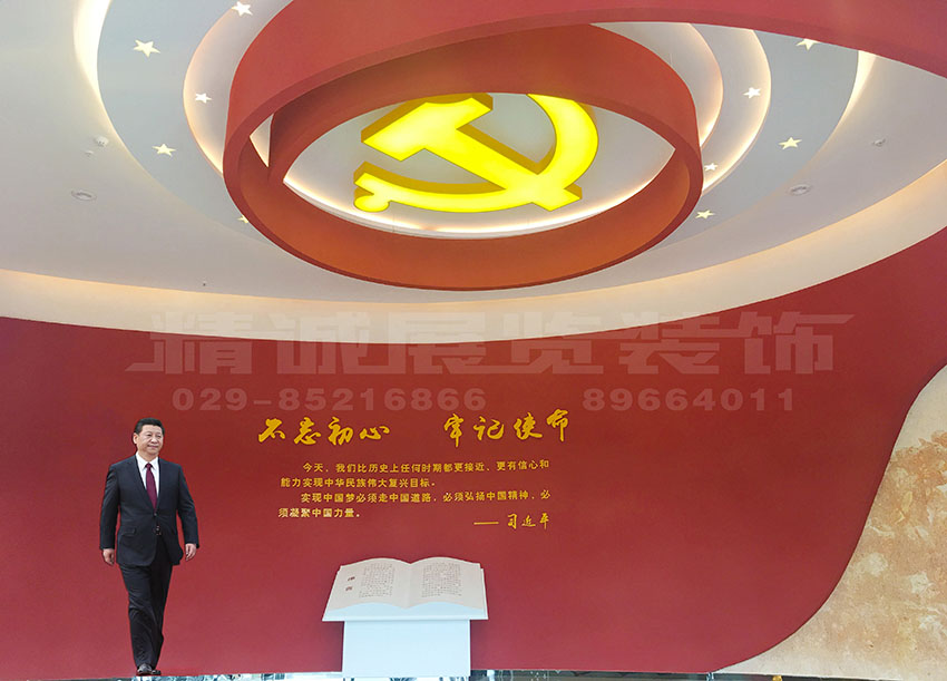 序廳的主要功能是展示習(xí)近平總書記關(guān)于“不忘初心 牢記使命”的重要講話,進(jìn)入序廳,可以看到鮮紅的異形旗幟飄向頂部,與黃色黨徽交相輝映,在恢弘大氣的浮雕背景襯托下,顯示出濃厚的黨建教育氛圍。