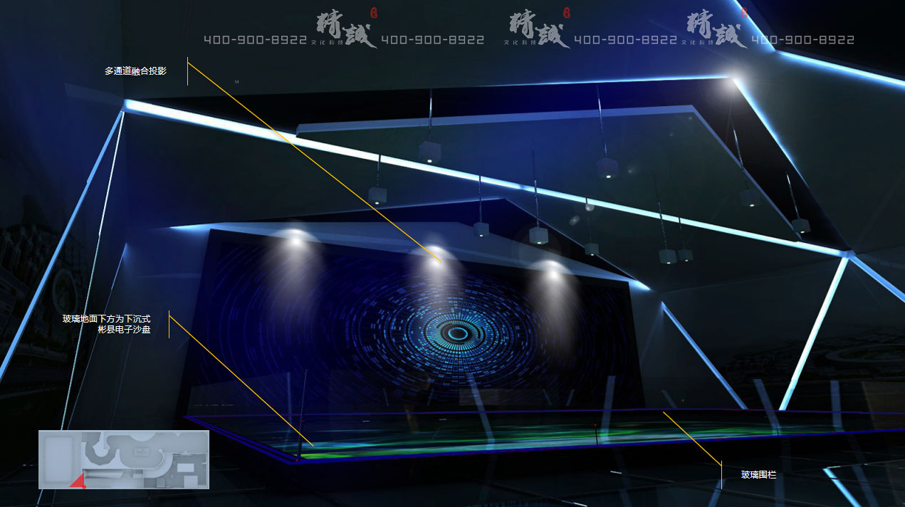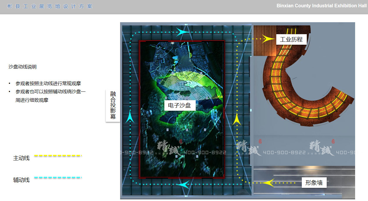 沙盤:大型下沉式多通道投影電子沙盤,配合墻面投影播放的宣傳片,立體展示彬縣概況、人文歷史、工業(yè)歷程、園區(qū)規(guī)劃、產(chǎn)業(yè)轉(zhuǎn)型、優(yōu)質(zhì)產(chǎn)品、未來(lái)展望等內(nèi)容,時(shí)長(zhǎng)約5分鐘。