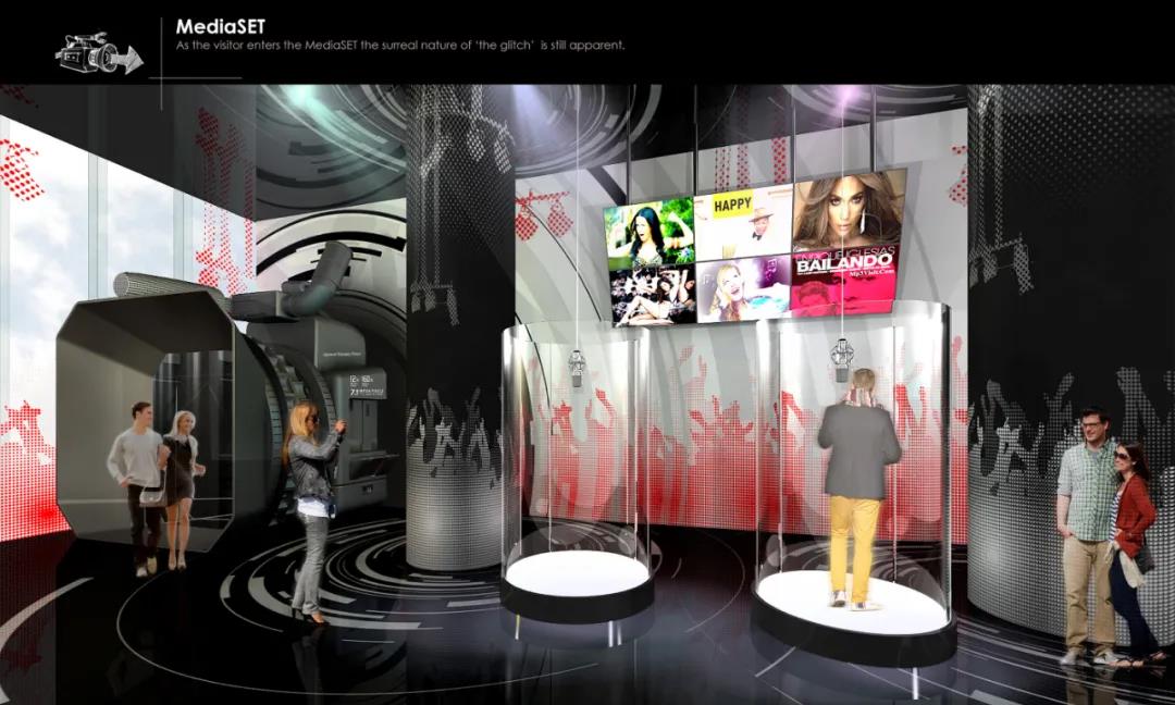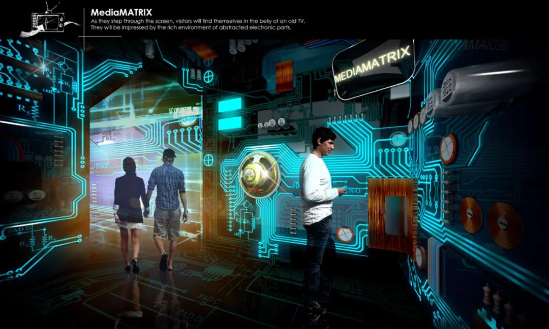 媒體矩陣:當參觀者走過屏幕時,他們會發(fā)現(xiàn)自己置身于一臺舊電視里,他們將會被抽象的電子部件所構(gòu)成的豐富環(huán)境所震撼。