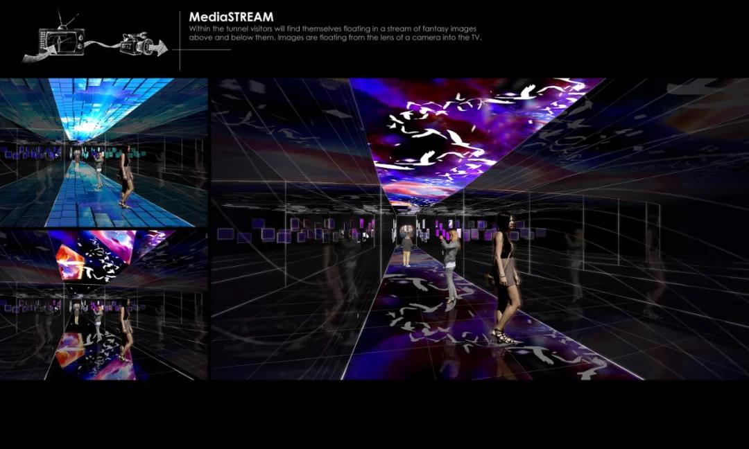 媒體流在隧道里,游客們會發(fā)現(xiàn)自己漂浮在他們上面和下面的一系列幻想圖像中。影像從照相機的鏡頭浮到電視上。