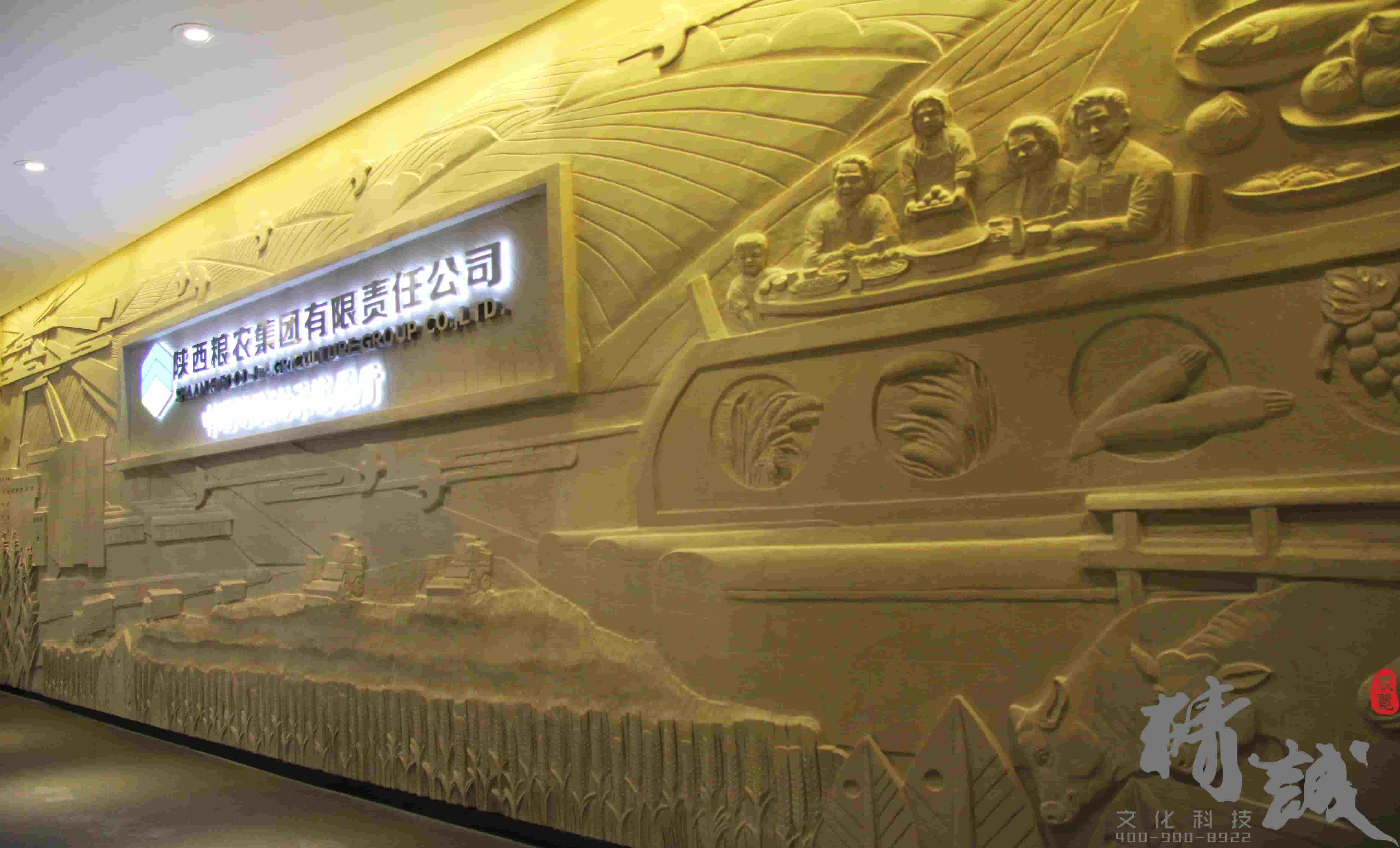 步入展廳入口,整面砂巖墻通過幾組不同場景的浮雕組合,展示了糧農(nóng)產(chǎn)品從田間到餐桌的全生產(chǎn)鏈,給人沉穩(wěn)的視覺體驗(yàn),在朝陽的映襯下,畫面寓意糧農(nóng)集團(tuán)代表著中國糧食行業(yè)即將迎來輝煌而嶄新的未來。浮雕畫的形式,彰顯集團(tuán)的農(nóng)業(yè)基石地位,大氣恢宏中彰顯集團(tuán)不凡實(shí)力。