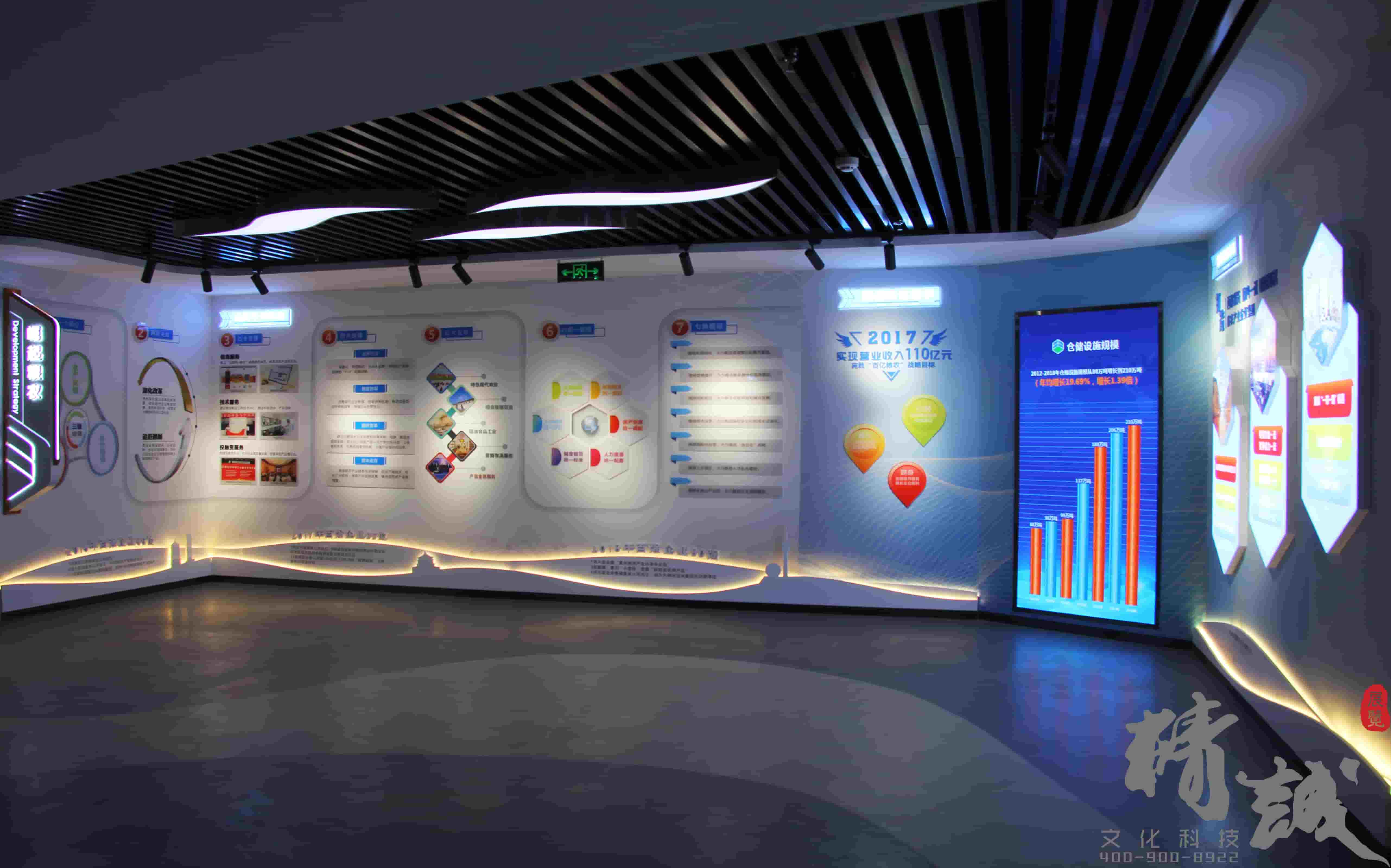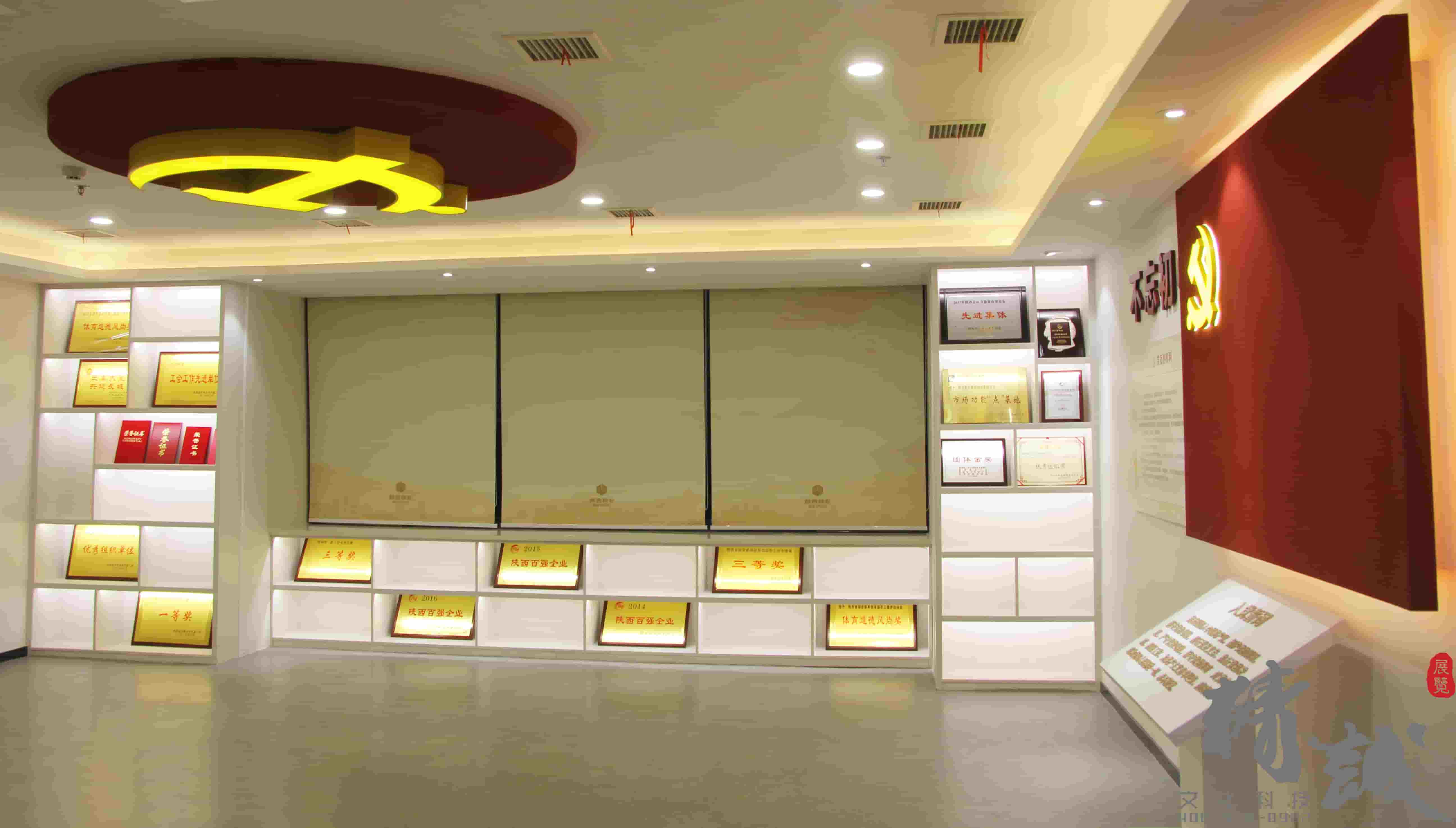 該板塊采用墻面圖文展板+多媒體顯示屏,并結(jié)合細(xì)節(jié)化背發(fā)光式場景墻面裝飾,以頂墻地三面結(jié)合的畫面形式,對集團(tuán)的發(fā)展、榮譽(yù)進(jìn)行展示,達(dá)到視覺的豐富感和連貫性。