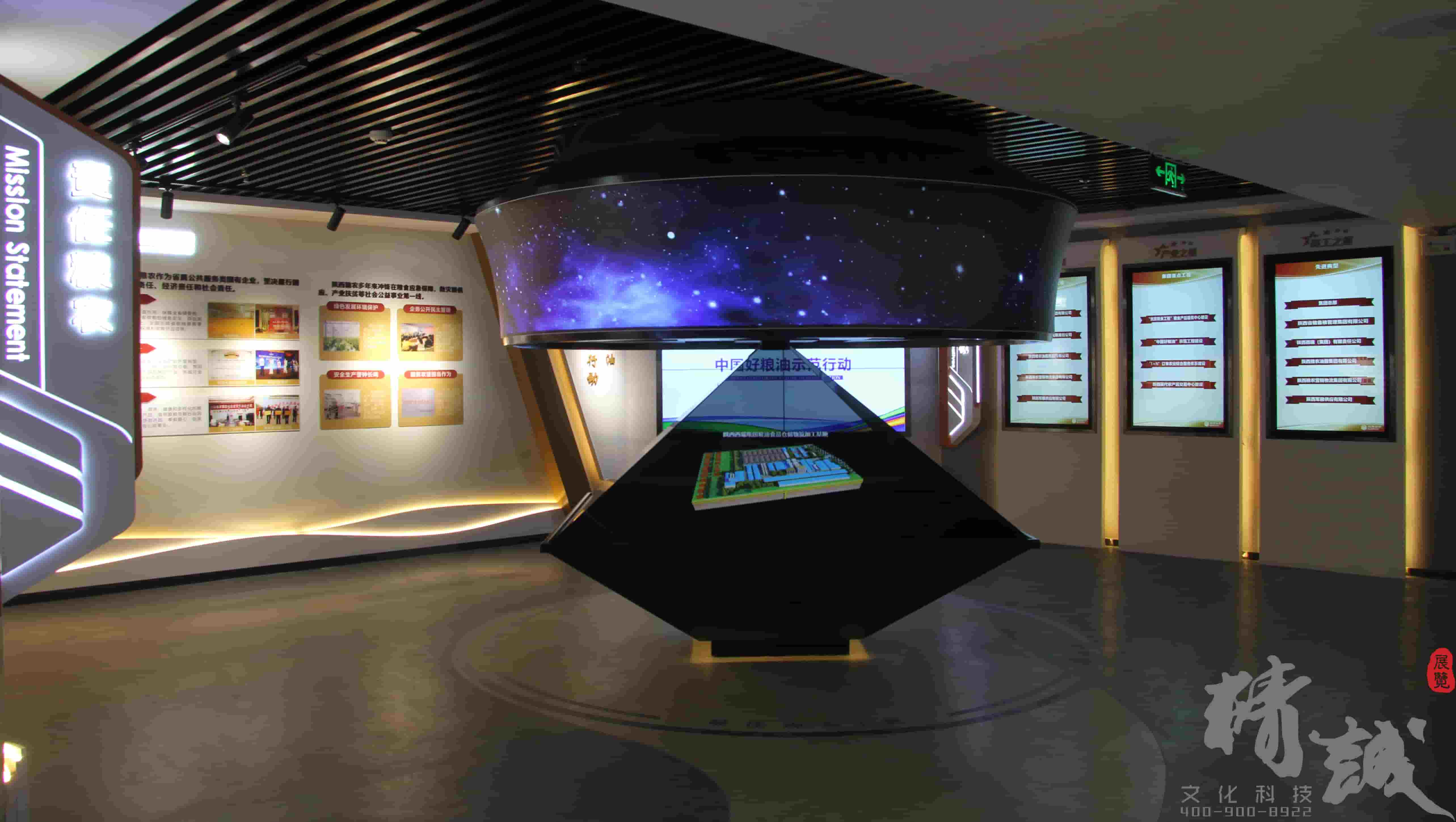 增加觀者的互動參與感。場景體驗(yàn)區(qū),設(shè)置五大體驗(yàn)板塊,分別以透明液晶屏,AR,實(shí)景沙盤等多媒體技術(shù),展現(xiàn)糧農(nóng)集團(tuán)從生產(chǎn)到物流倉儲及質(zhì)量把控等環(huán)節(jié)的技術(shù)詳細(xì)呈現(xiàn)。