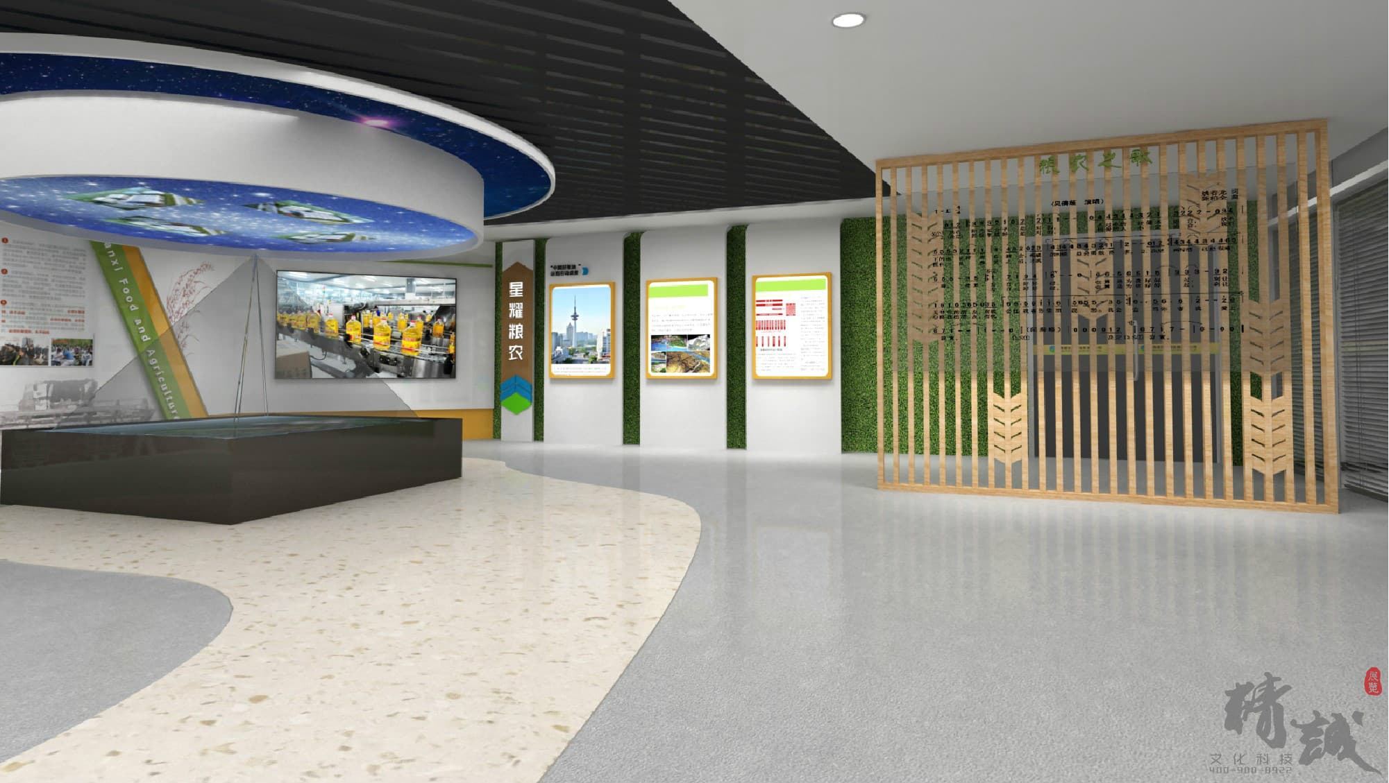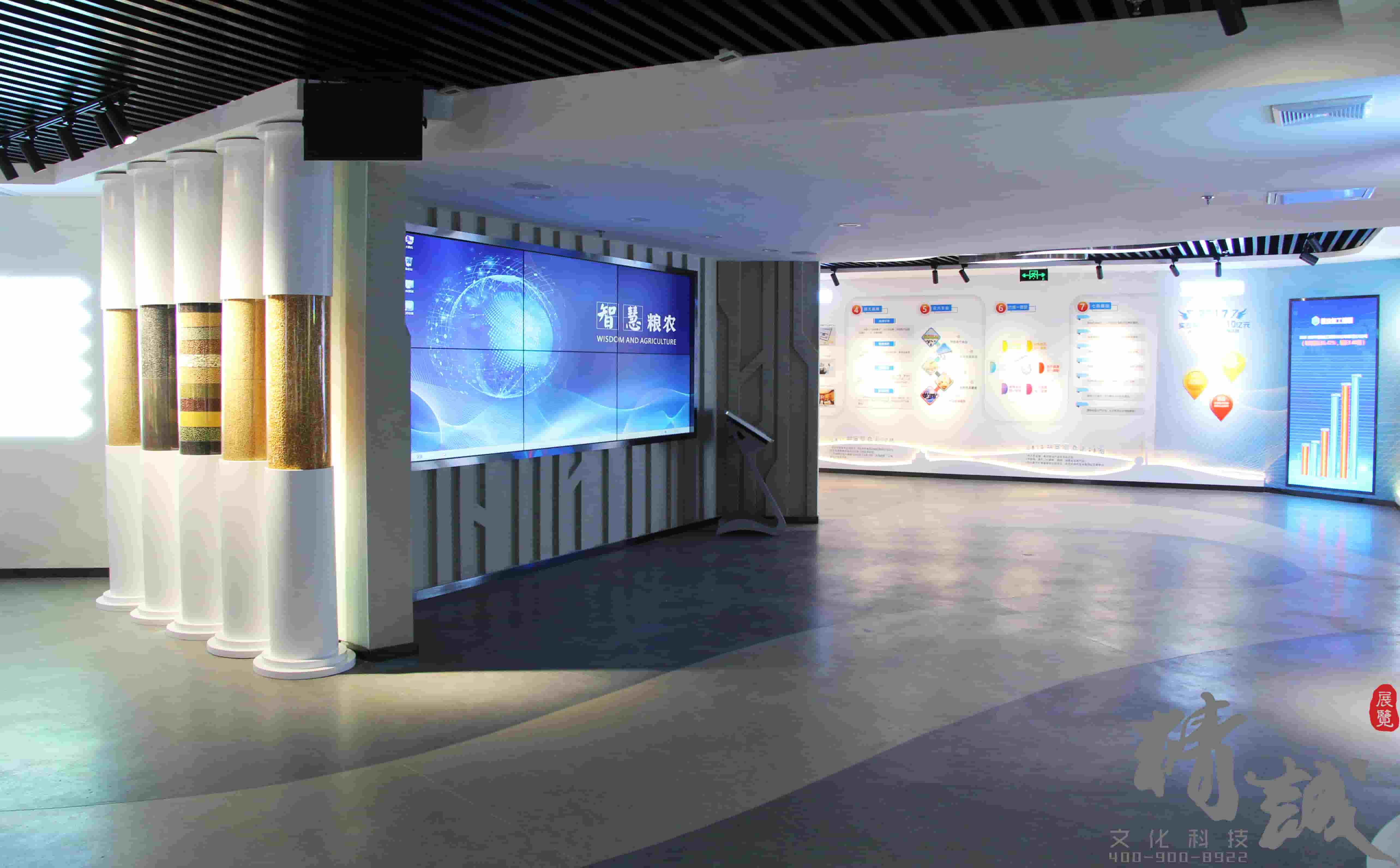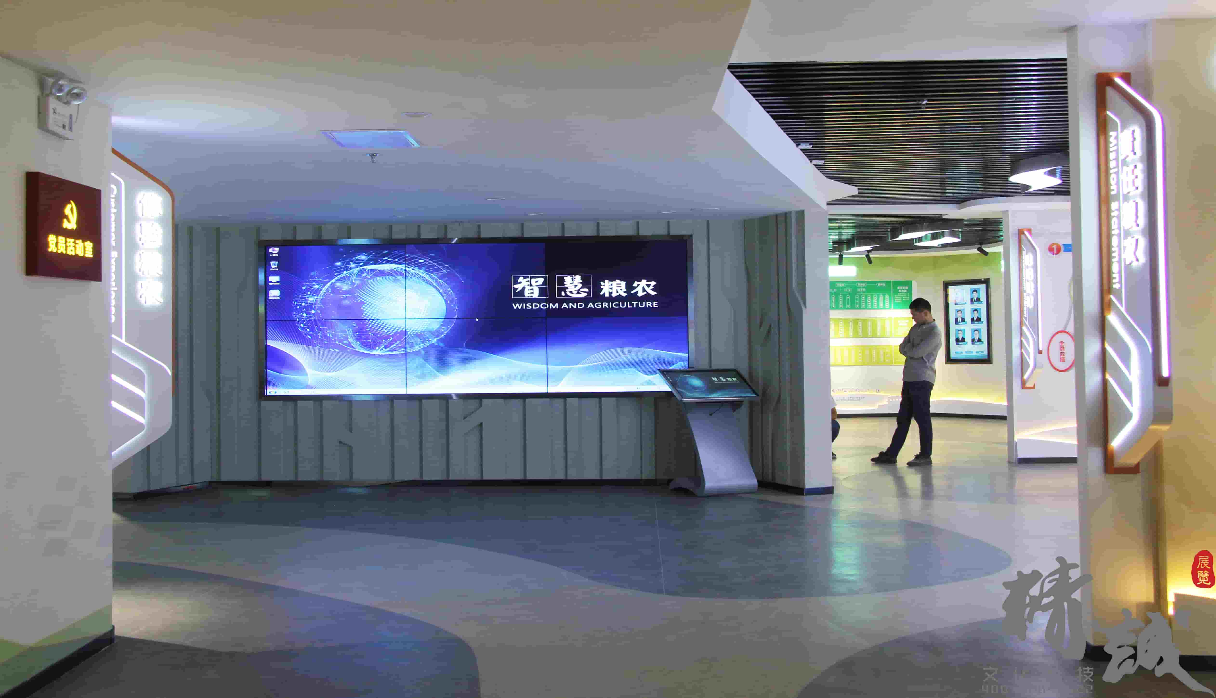 采用液晶顯示屏打造一面榮譽(yù)墻,展現(xiàn)員工之星、企業(yè)之星、產(chǎn)業(yè)之星等內(nèi)容。格柵造型隔斷,展現(xiàn)糧農(nóng)之歌,有效隔開空間并考慮展廳的視覺通透性。