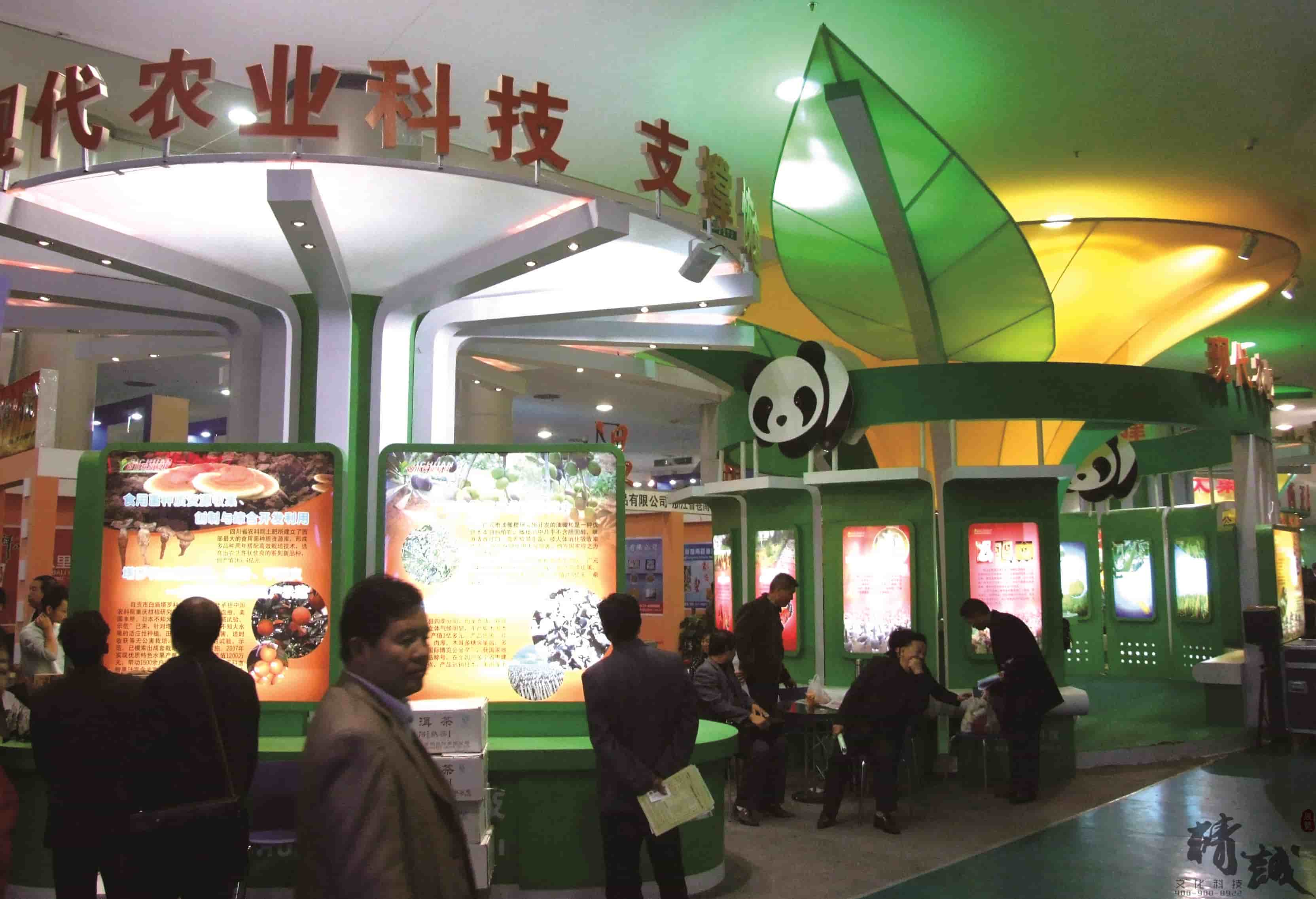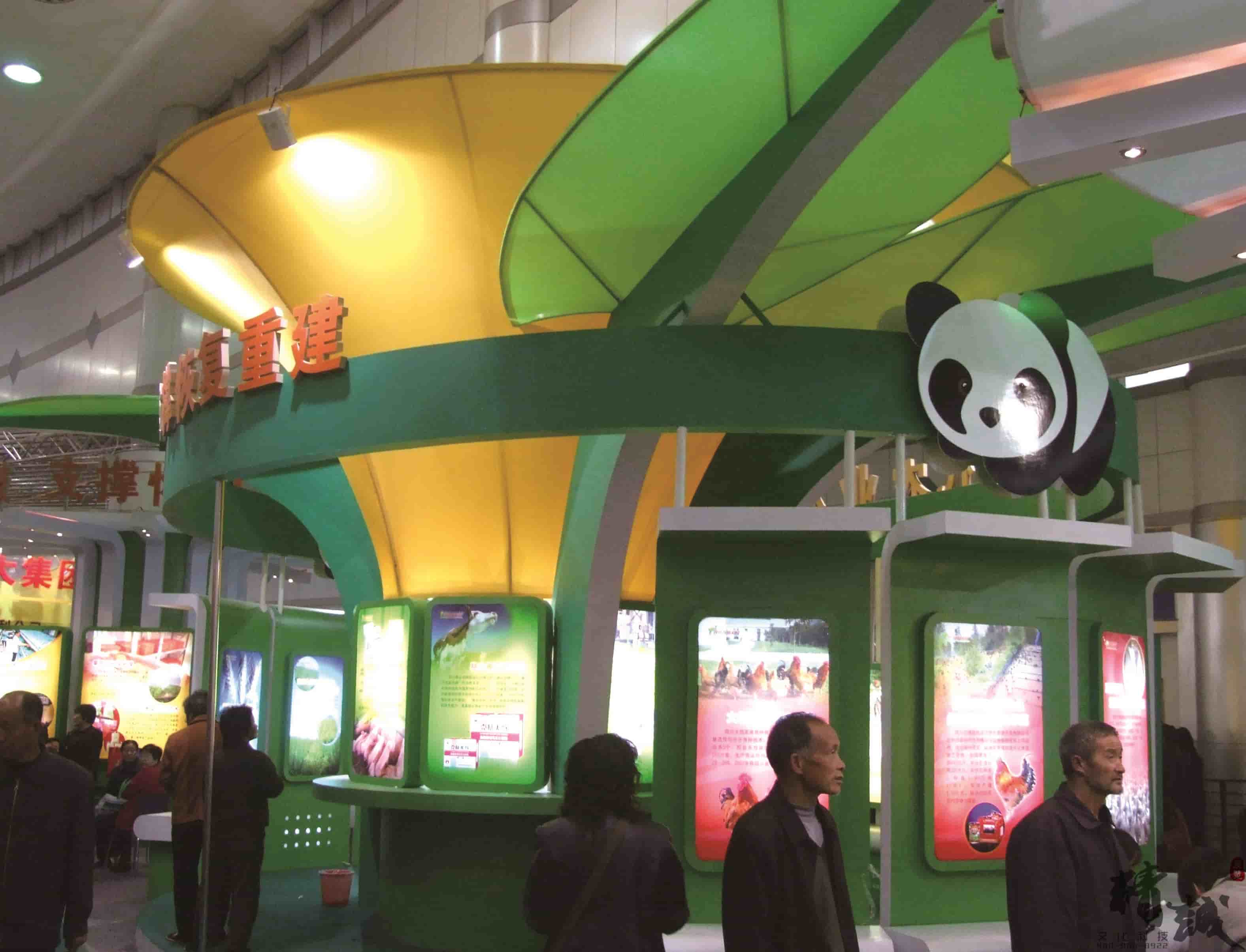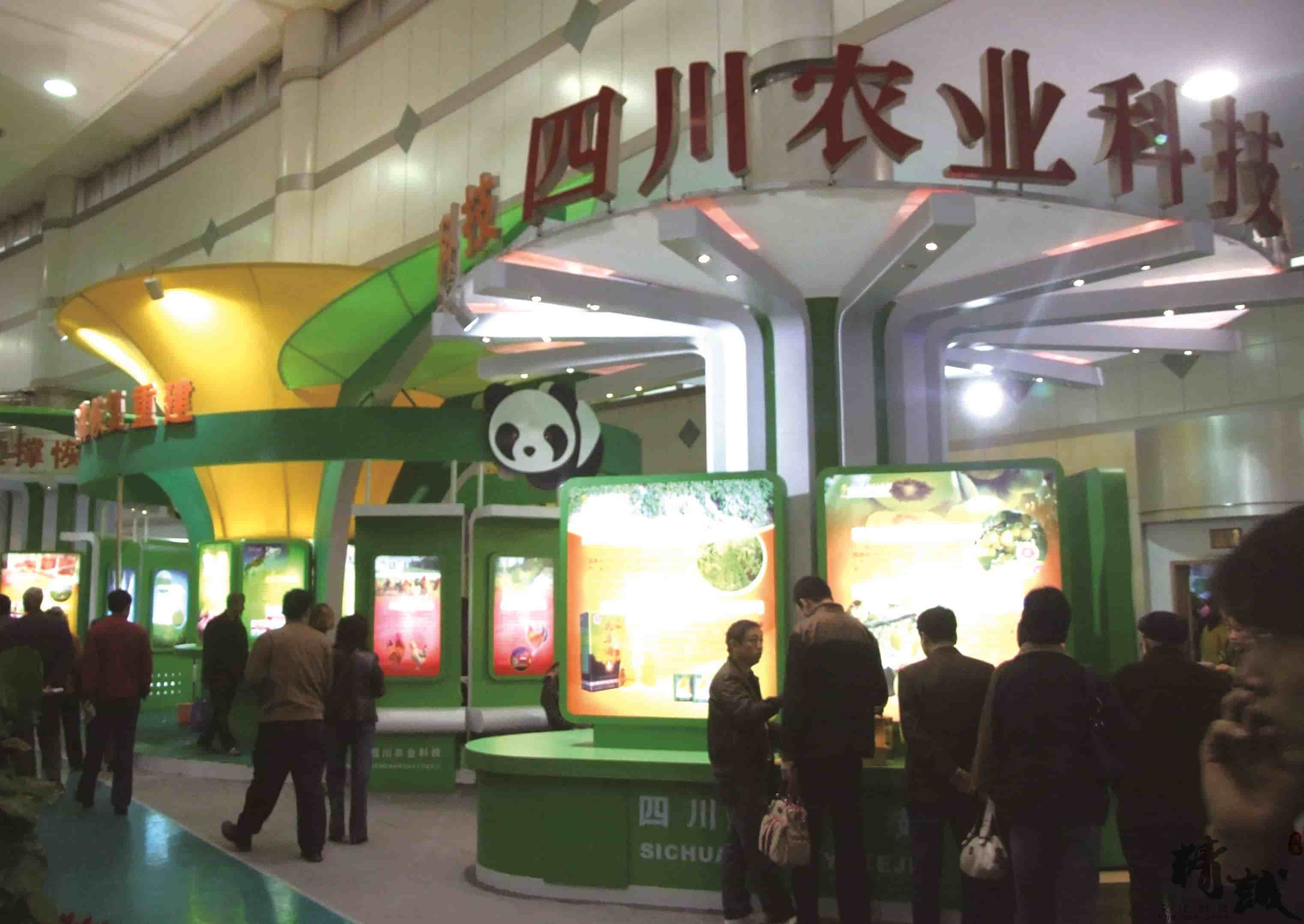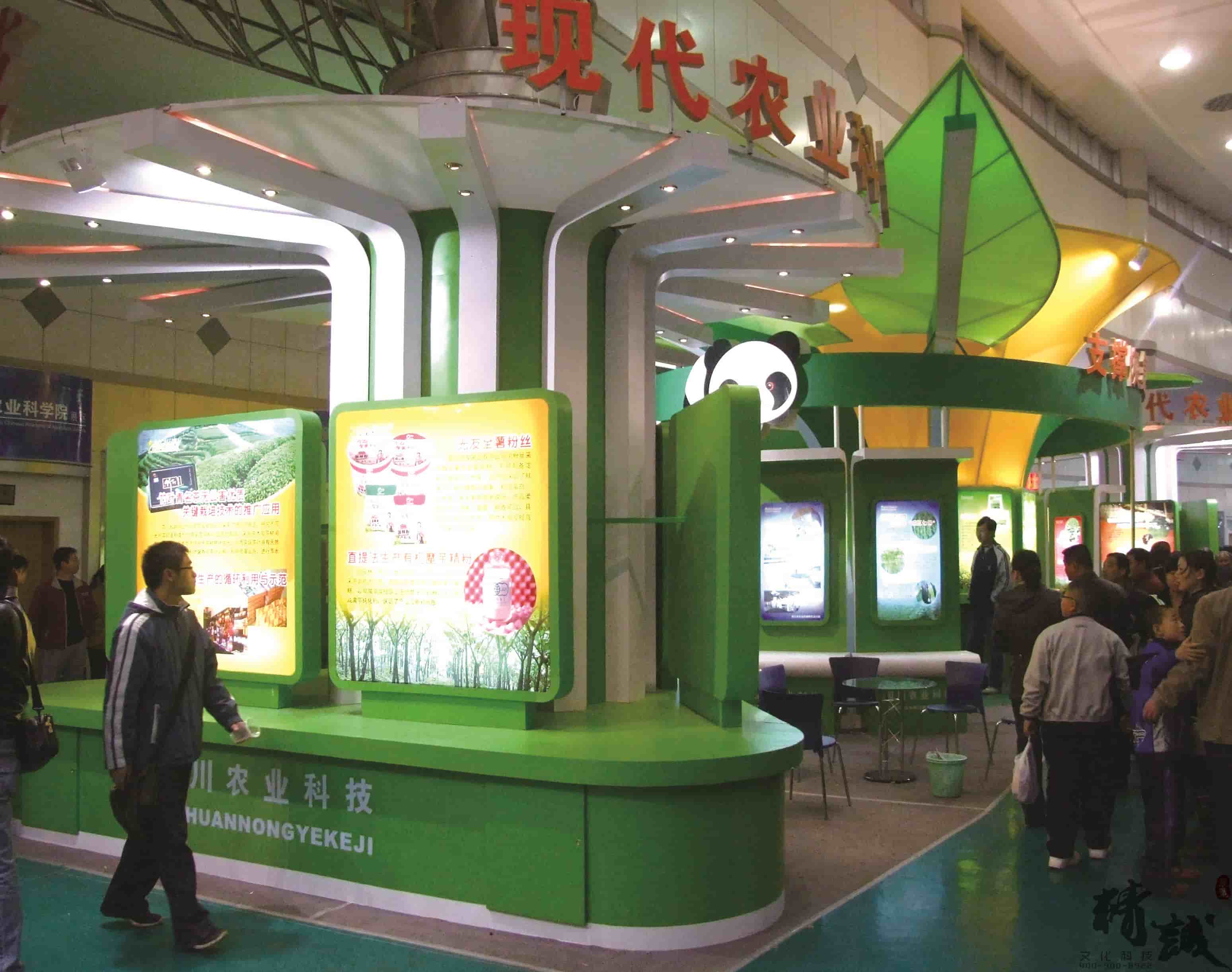 展位設(shè)計(jì)以綠色為主色,體現(xiàn)出四川綠色生態(tài)的現(xiàn)代農(nóng)業(yè);恰當(dāng)?shù)恼古_(tái)設(shè)計(jì),便于特色產(chǎn)品的展示;“國(guó)寶”熊貓雕刻畫(huà)裝飾,使得展位賦予了活潑與動(dòng)態(tài)感。整個(gè)展位突顯了四川的綠色、生態(tài)。