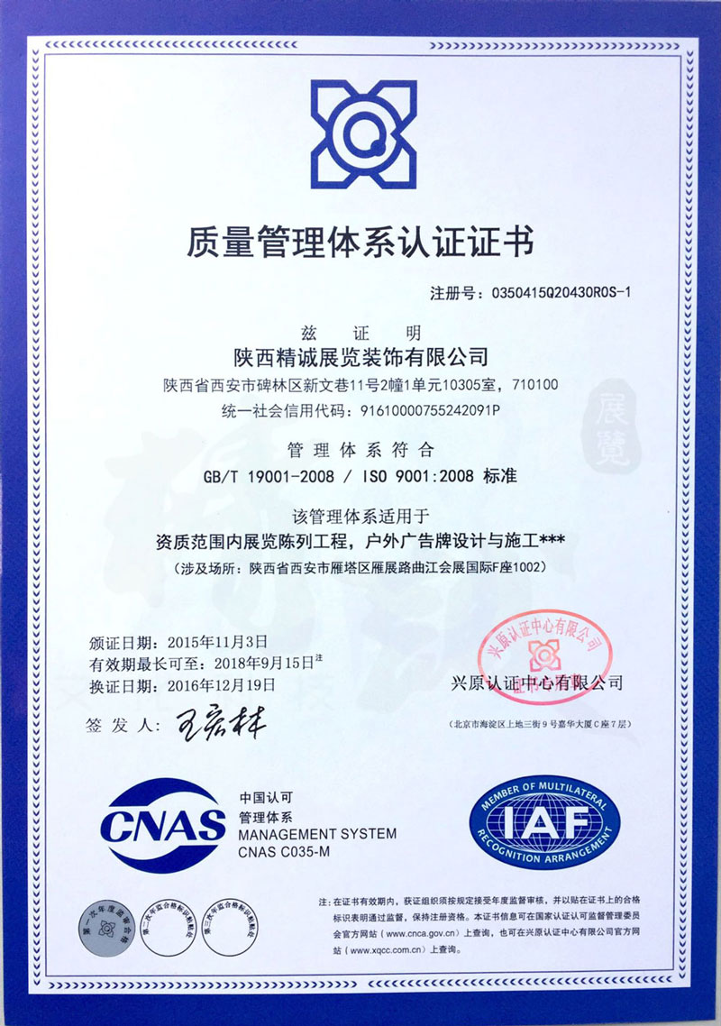 - 陜西精誠展覽裝飾有限公司質量管理體系認證證書 -